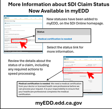 State Disability Insurance (SDI), which includes Paid Family Leave, is a complex public benefit program that requires a doctor, nurse practitioner, or health professional to submit a medical certification to complete a benefit claim. A claim will be delayed if EDD doesn’t receive that certification from the medical professional. The expanded claim status information now notifies customers if their certification is missing.