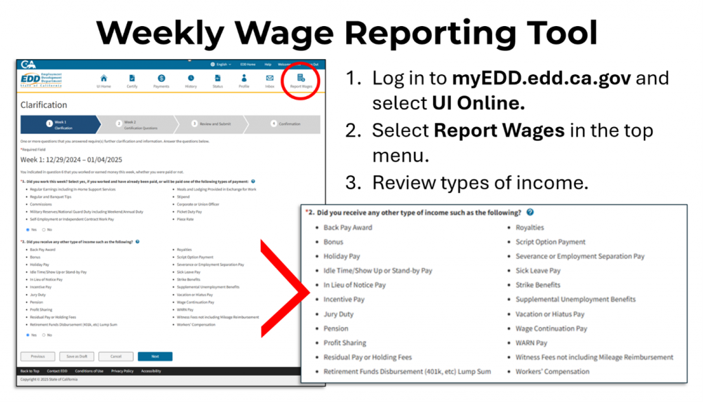 Listening to unemployment customers, EDD learned that the wage reporting requirements can be confusing given the vast variety of earnings they may have to report, the differences between when wages are earned and when the individual is actually paid, and between gross wages (earned before any deductions) and net wages.