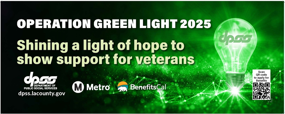 DPSS will join many other government facilities illuminating their headquarters entrance green to launch Operation Green Light. By shining a green light, DPSS will let the County’s veterans know that they are seen, appreciated, and supported. The effort will also open conversations about the needs of veterans and the services that support veteran communities.