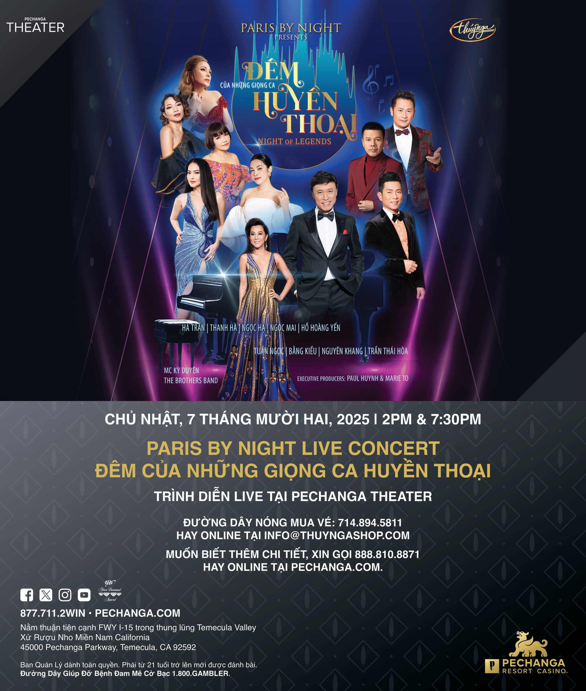 Paris by Night hân hạnh giới thiệu cùng quý khán thính giả hai buổi văn nghệ  vào lúc 2:00 chiều và 7:30 tối Chủ Nhật 7 tháng 12 năm 2025 với chủ đề “Đêm Của Những Giọng Ca Huyền Thoại” trên sân khấu tráng lệ của rạp Pechanga Theater.