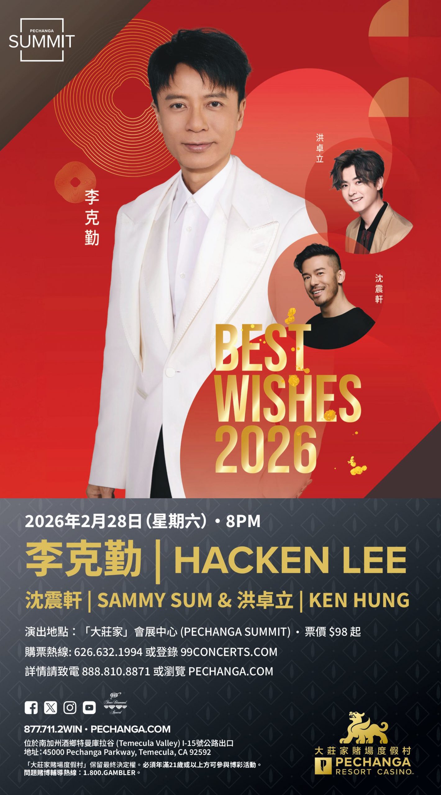 Pechanga 「大莊家賭場度假村」, 將於2月28日 (星期六)在「大莊家」會展中心, 隆重呈獻《BEST WISHES 2026演唱會》,由香港流行音樂超級巨星李克勤,攜手洪卓立和沈震軒以勁歌金曲為大家慶祝農曆新年。