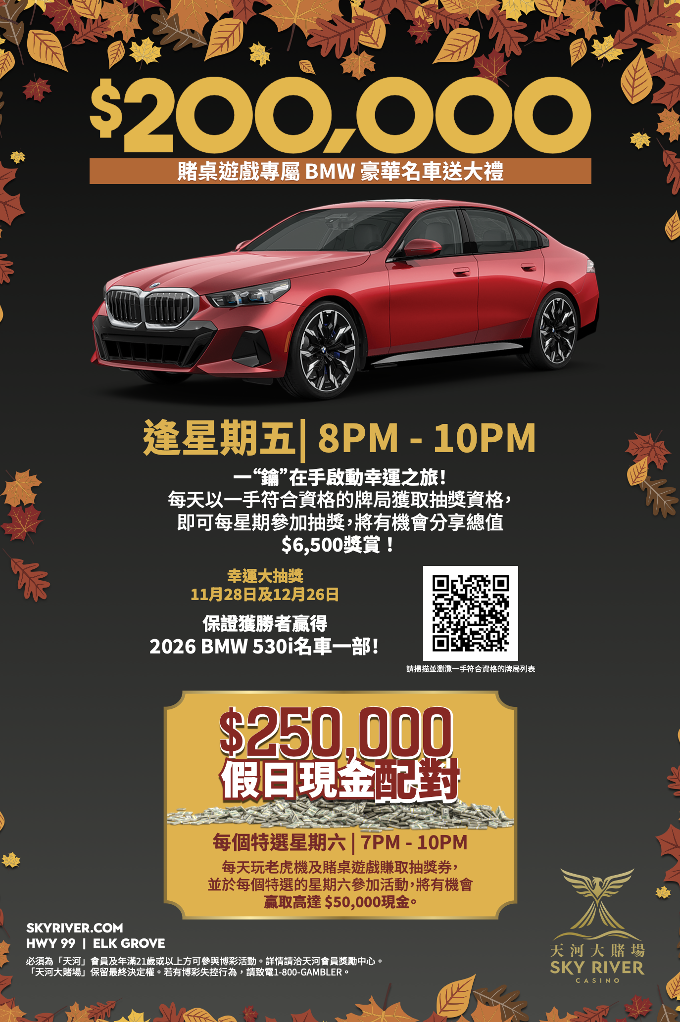 Elk Grove, CA – 「天河大賭場」推出令人驚喜的節慶推廣活動,涵蓋 11 月和 12 月,以$450,000獎賞拉開序幕,其中最引人注目的是價值$200,000賭桌遊戲專屬BMW豪華名車送大禮,以及$250,000假日現金配對大獎賞。這些前所未有的節慶優惠包括:保證送出兩輛 2026年BMW 530i 名貴房車,以及在整個節慶期間贏取高達$50,000現金獎賞的多重機會。