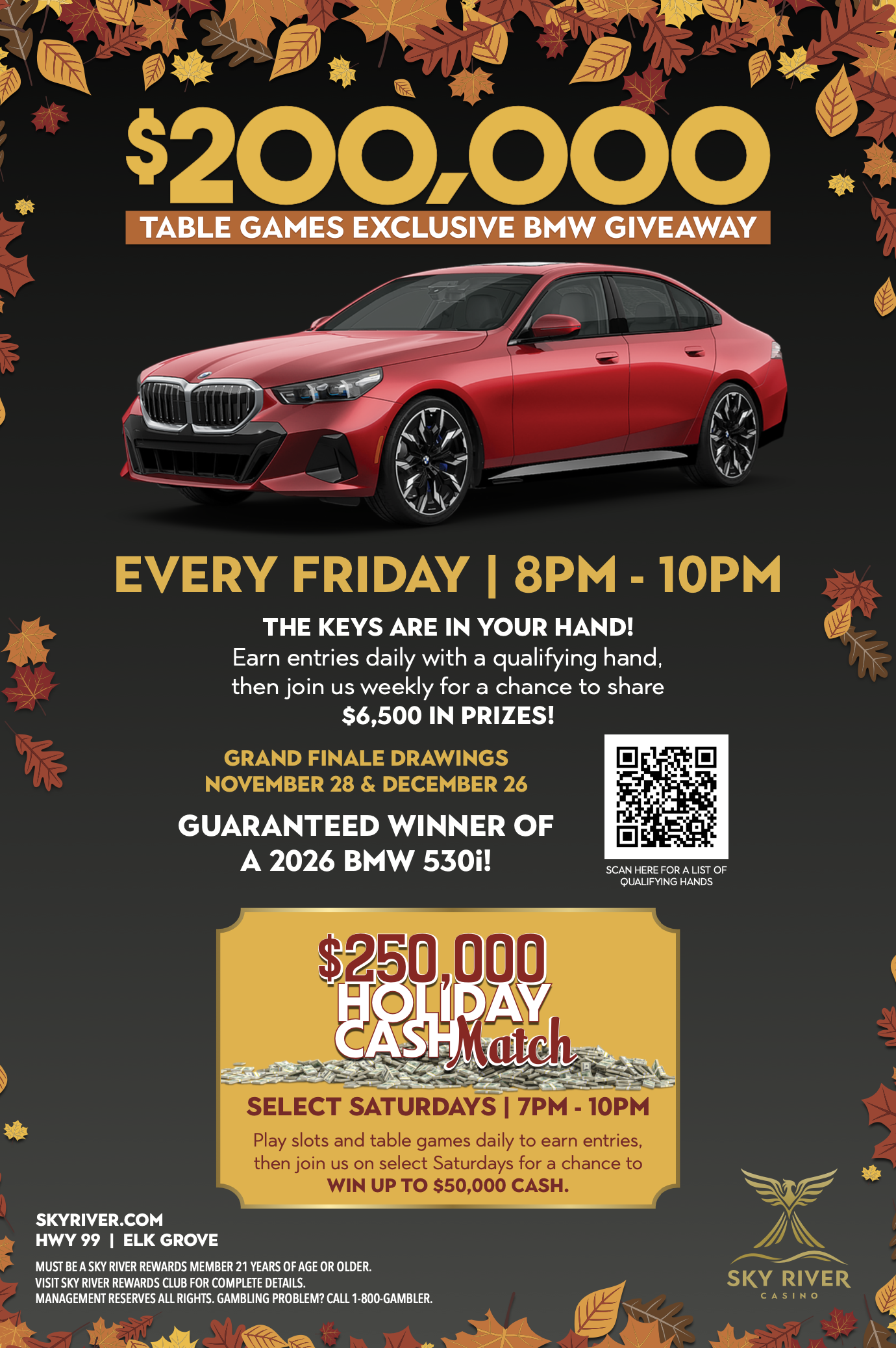 Elk Grove, CA – Sky River Casino ushers in the holiday season with an impressive $450,000 promotion lineup spanning November and December, headlined by the $200,000 Table Games Exclusive BMW Giveaway and the $250,000 Holiday Cash Match. The unprecedented holiday offerings include two guaranteed 2026 BMW 530i winners and multiple opportunities to win up to $50,000 in cash prizes throughout the festive season.