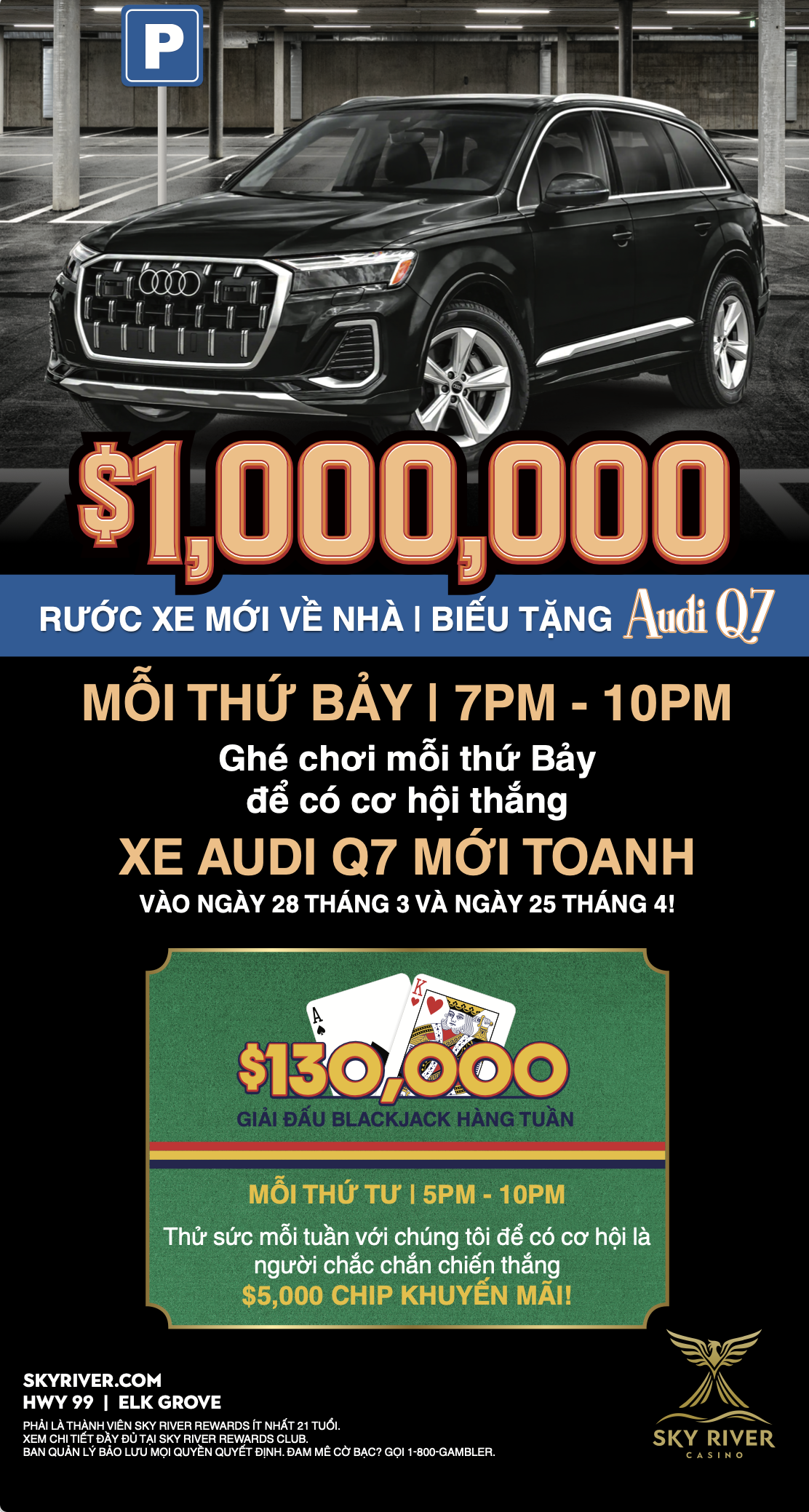 Mỗi thứ Bảy từ ngày 07 tháng 3 đến ngày 25 tháng 4, khách có thể tham gia chương trình Rước Xe Mới Về Nhà $1,000,000 Audi Q7 để có cơ hội trúng tiền mặt, Chơi Miễn Phí, và đặc biệt là lái về nhà chiếc Audi Q7 mới toanh. Ngoài ra, sẽ đảm bảo trao một chiếc Audi Q7 tại vòng Chung Kết vào ngày 28 tháng 3 và ngày 25 tháng 4. Người chơi có thể tích lũy vé số hàng ngày khi chơi máy kéo và bài bàn bằng thẻ Sky River Rewards.