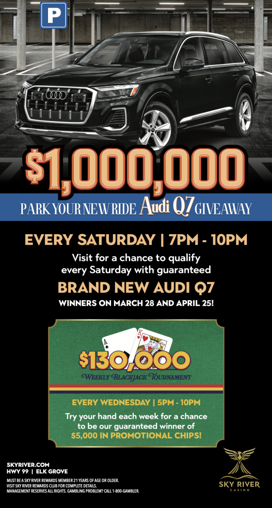 Every Saturday from March 7 through April 25, guests can participate in the $1,000,000 Park Your New Ride Audi Q7 Giveaway for the chance to win cash, Free Play, and ultimately drive home in a brand-new Audi Q7, Plus, a Guaranteed Audi Q7 will be awarded during the Grand Finale drawings on March 28 and April 25. Entries can be earned daily by playing slots and table games with a Sky River Rewards card.